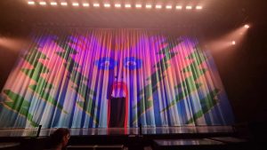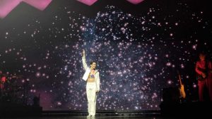 Vient ensuite la performance de Big Girl, où le showman décide de descendre dans la foule, en se faufilant avec Max son bassiste pour traverser le zénith et faire revivre le bar du Butterfly Lounge le temps d’une chanson. Après les paillettes, c’est au tour du piano magique de rentrer en scène pour illustrer la palette de couleurs de son tube Grace Kelly.
