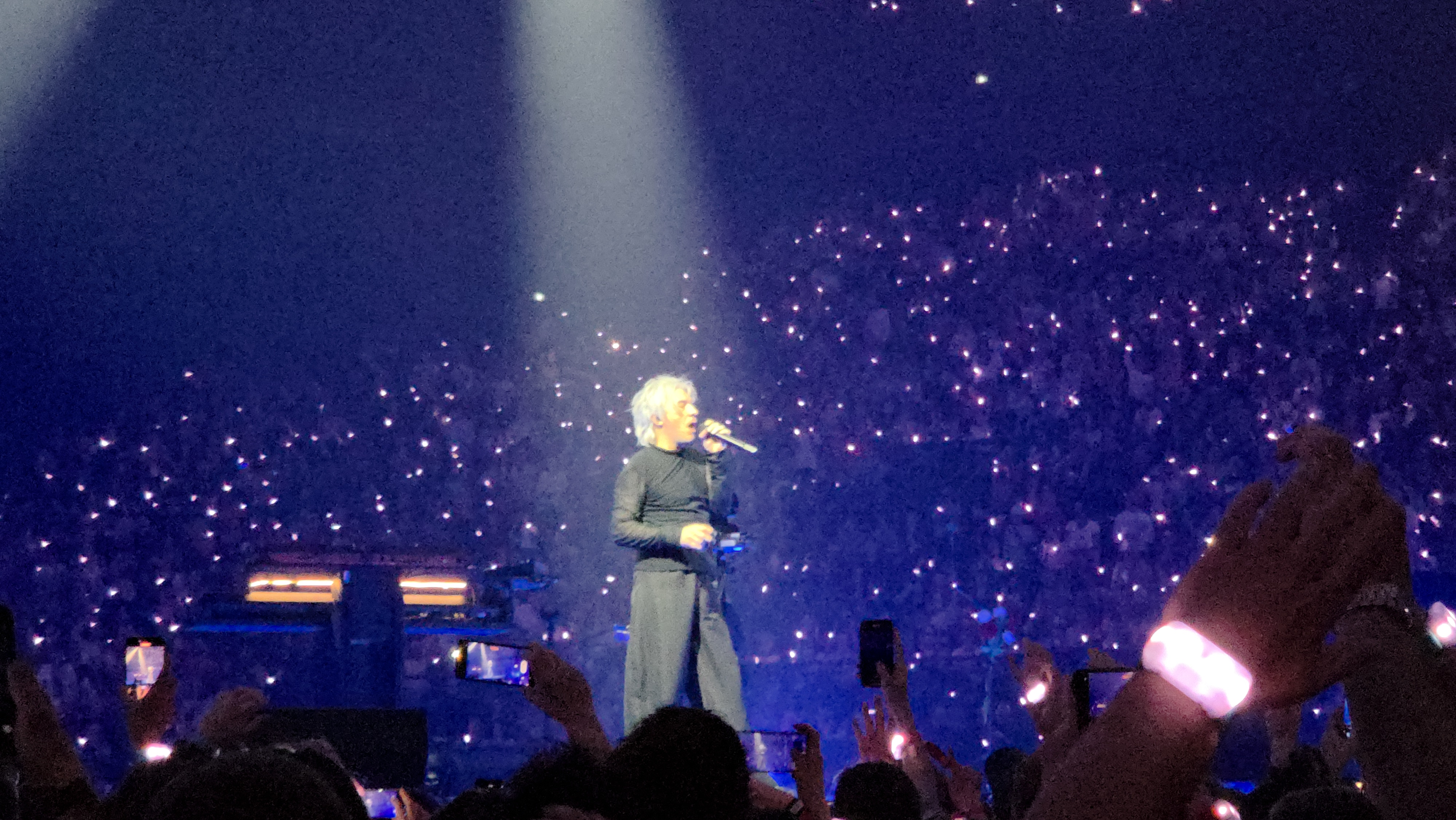 Les titres ? Le mélange des chansons de leur dernier album et des hits les plus populaire du groupe se fait à merveille. Le concert commence avec Babel Babel, L’amour fou, Victoria suivi du Chant des cygnes et nombreux autres titres engagés. Parce qu’Indochine c’est bien un groupe engagé et humain. Les messages de paix, de tolérance, d’écologie, de diversité et de liberté d’expression. Entre deux hits comme Canary Bay, A nos célébrations, la scène se déporte sur l’avant de l’avancée pour le plus grand plaisir du public des gradins qui voient le show venir à eux. Nicola Sirkis alterne entre les différents angles de la scène, une pluie de confettis, les bracelets à LED et le ciel étoilé multicolore emportent l’audience dans le temps suspendu de « J’ai demandé à la lune » jusqu’à » La Belle et la Bête » sorti en décembre dernier, les paroles sont connues de tous, peu importe l’âge. Nicola Sirkis en plaisante d’ailleurs en disant que trois quart de la salle n’était surement pas nés pour la sortie certaines chanson.