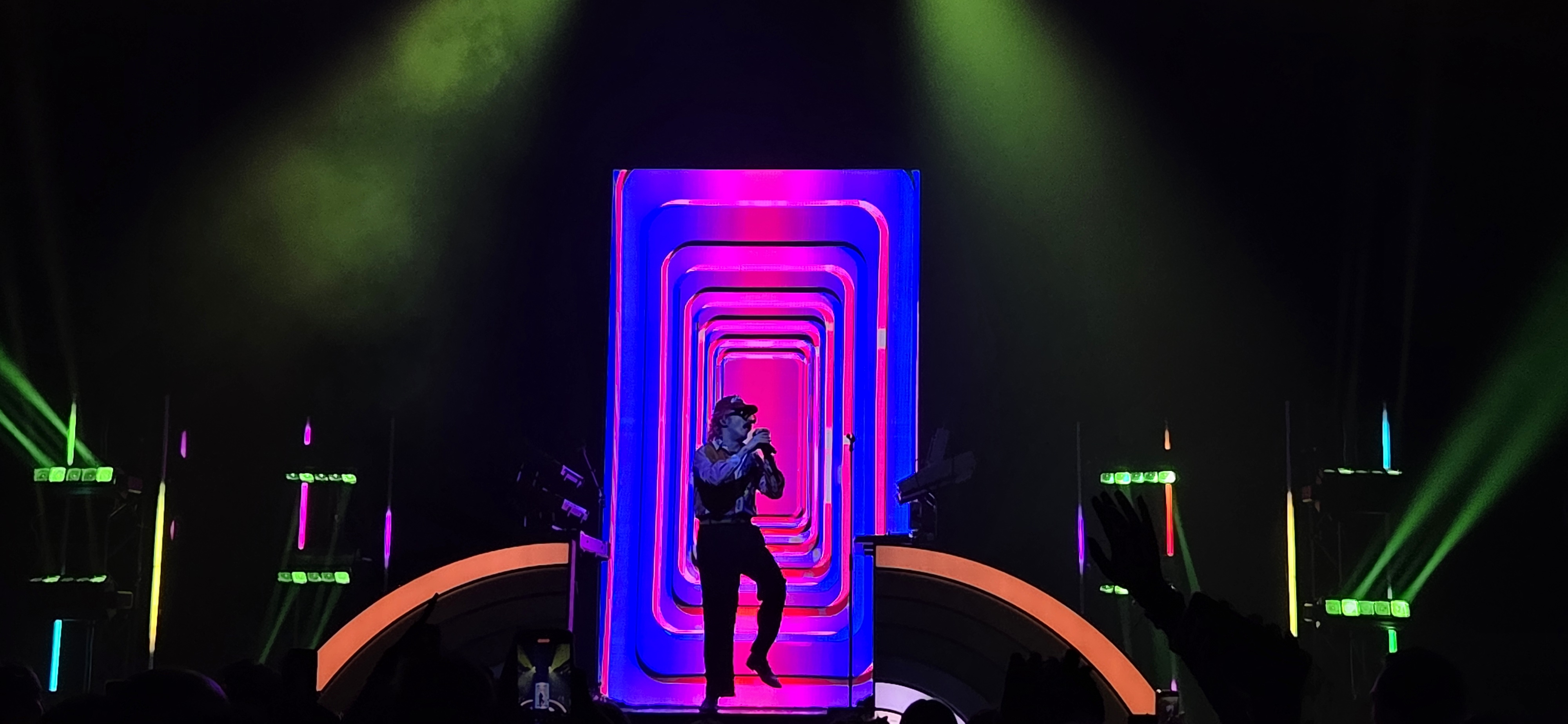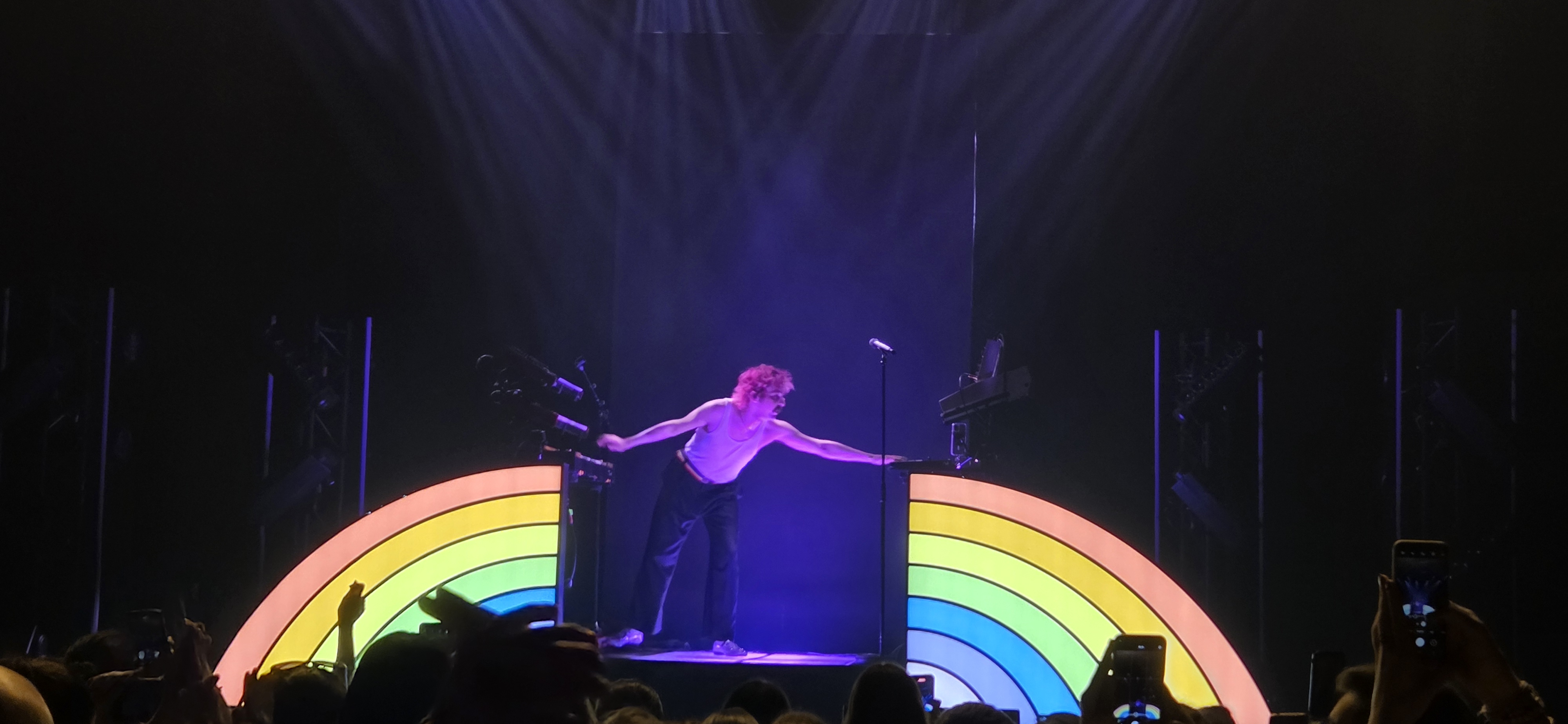 21h28, l’ambiance s’électrise, la salle est plongée dans le noir avant l’entrée de la boule d’énergie colorée Julien Granel. Chevelure rose reconnaissable parmi tant d’autres, T shirt en clin d’œil à ses amis toulousains Big Flo et Oli, il s’avance en courant et en sautant, pour rejoindre son estrade arc en ciel comportant de nombreux pianos et machines dont lui seul a le secret. Seul sur scène, il alterne entre morceaux électro funk et titres à succès comme Feel good ou Plus fort accompagnés de visuels psychédéliques. Le public est déchainé, il saute, danse, chante à tue-tête : on peut le dire le ton est donné, l’ambiance et folle. Julien descend même dans la fosse à plusieurs reprises pour danser avec le public, une communion festive et bon-enfant.